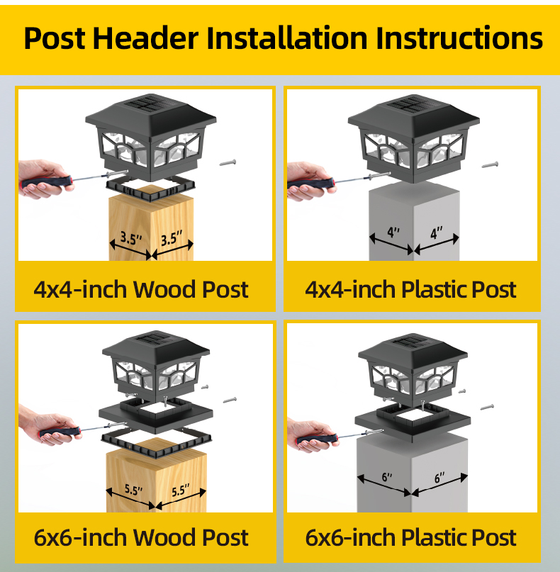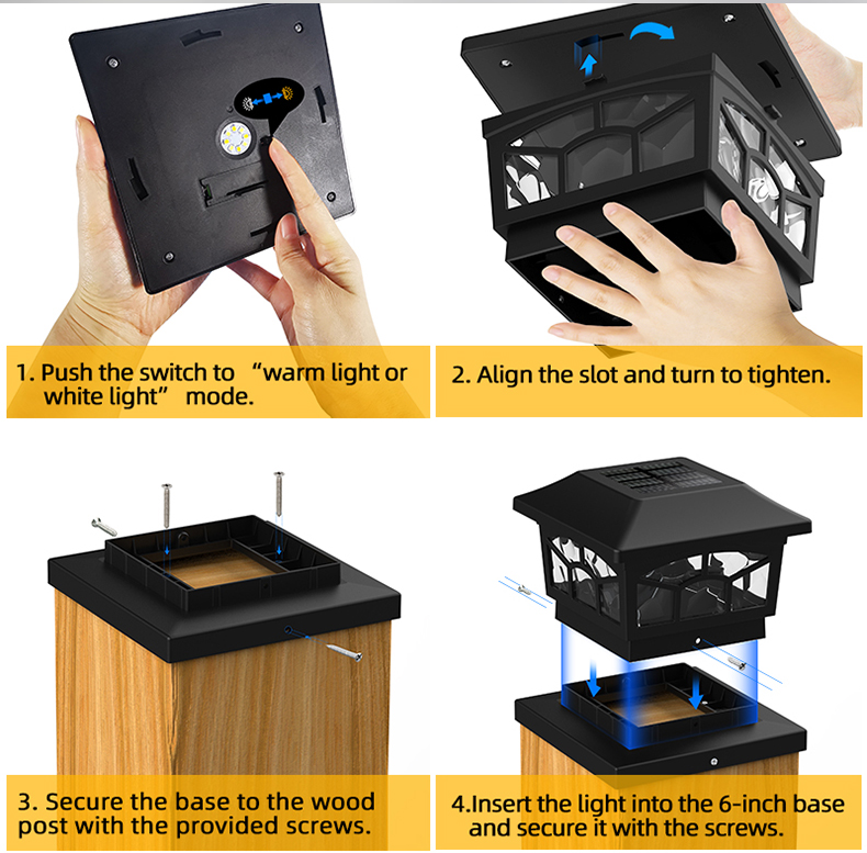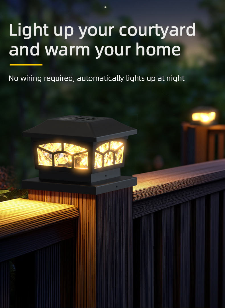 Landsigns Dual Mode Solar Post Cap Light Solar Garden Light har ett intelligent ljuskänsligt system, starkt vattentätt utomhus och lätt att installera, lämpligt för trädgårdsdekoration, trädgård, etc. Två belysningslägen, du kan fritt välja din favoritbelysning. Dual Mode Solar Post Cap Light Solar Garden Light kan monteras på väggen med medföljande skruvar på några sekunder, ingen kabel eller tråd behövs.